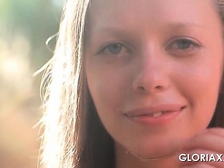 Awesome Gloria flashing her skinny bald quim outdoor