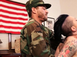 Army emo slut with tattoos fucked by her two sergeants