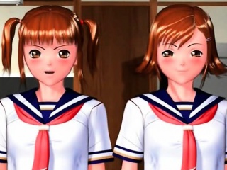Anime threesome with cute schoolgirls sharing dick