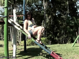 Naked t-girl swinging in the park gets covered in chocolate