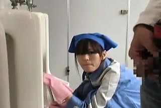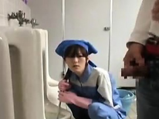 She's cleaning the urinal, sees him pee and decides to suck
