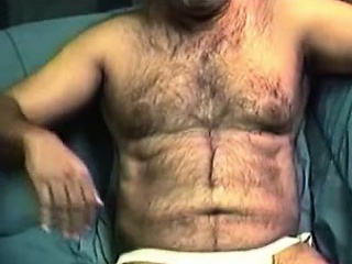 Hairy mature amateur Shawn solo plays with his cock on a bed