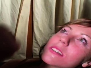 Naughty red head gets her slutty face filled with warm jizz