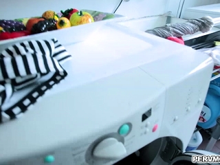 Stepson gets an eyeful as stepmom stands at the kitchen sink
