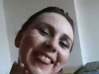 girl gets facialized and rubs cum all over her body