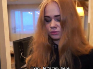 Debt4k. Cunning guy fucks shaved pussy of red-haired cutie