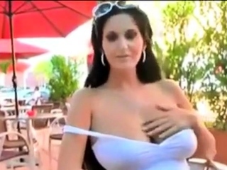 Very beauty brunette shows her huge boobs in a street cafe