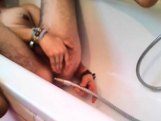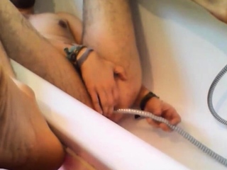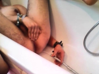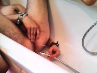Bi-guy using shower head, squirting water, enema