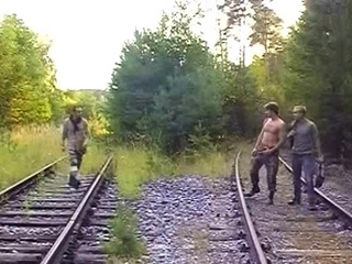 Threesome gay fuck on the railroad