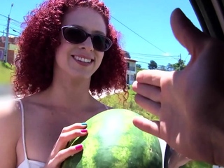 Redhead teen Latina covered in oil for blowjob and fuck