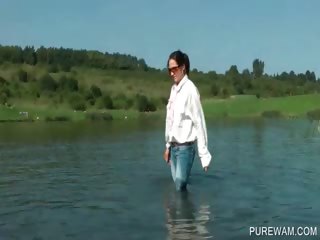 Clothed slut sensually touching wet body in the lake