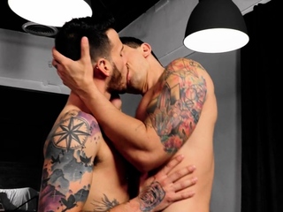 Tattooed hunk barebacks BF till load