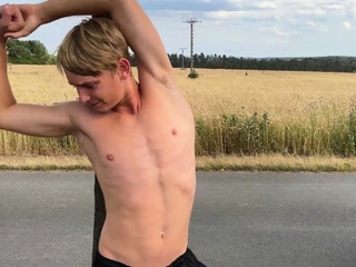 Cute teen blonde boy shows off his abs