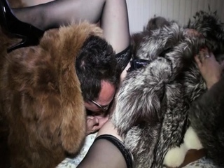 Mature brunette has sex in fur coats