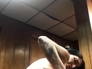 Busty curly brunette with big boobs fucks on couch