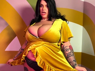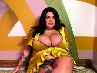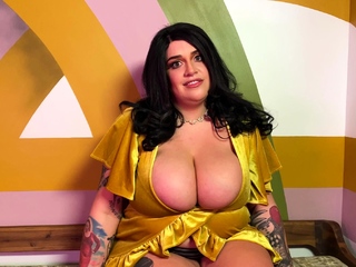 Busty curly brunette with big boobs fucks on couch