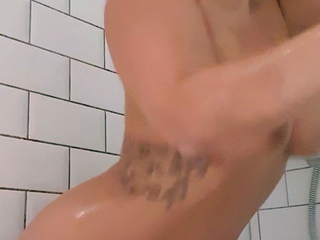 Hot babe with perfect big boobs taking shower